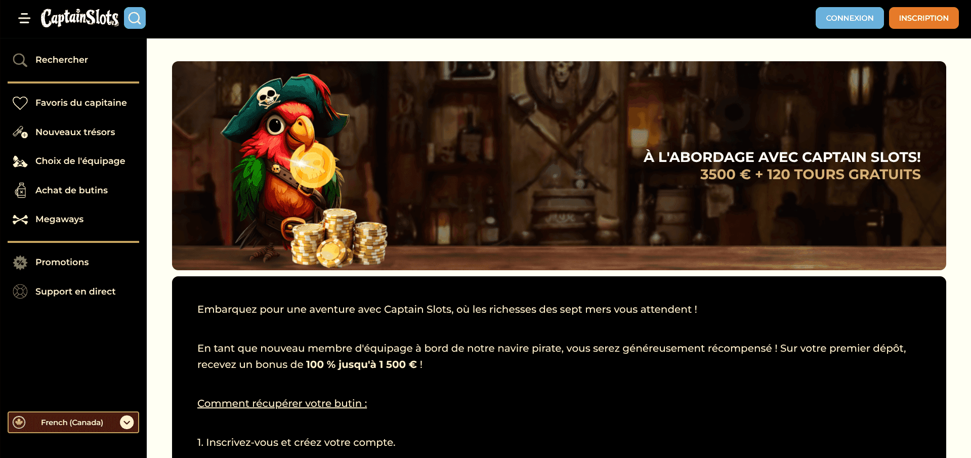 Lisez notre avis sur Captain Slots & recevez 5€ en cash sans dépôt pour jouer gratuitement. Bonus exclusif, jeux variés et retrait rapide garantis.