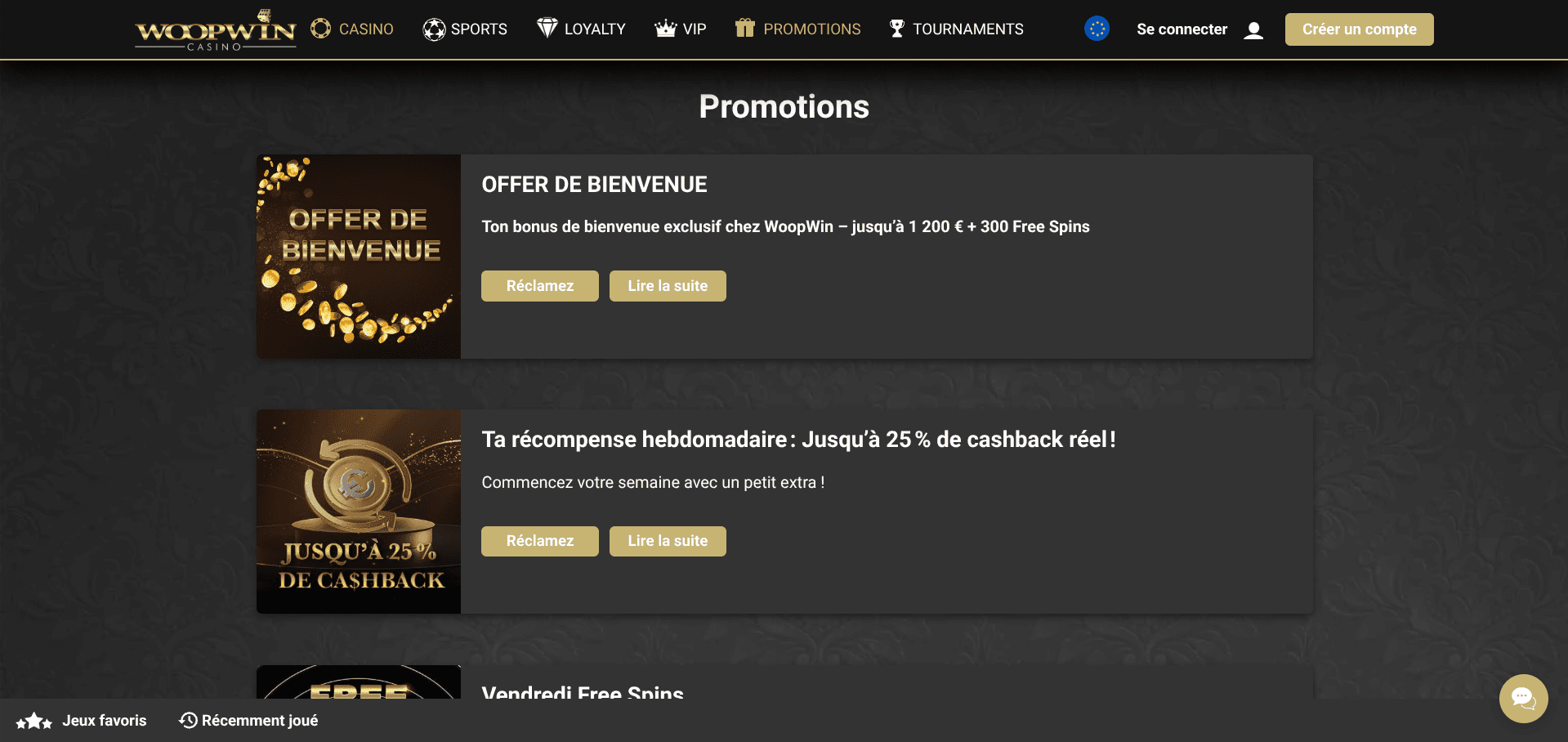 Pour ce qui est des autres promotions, voici ce que propose le casino en ligne Woopwin :