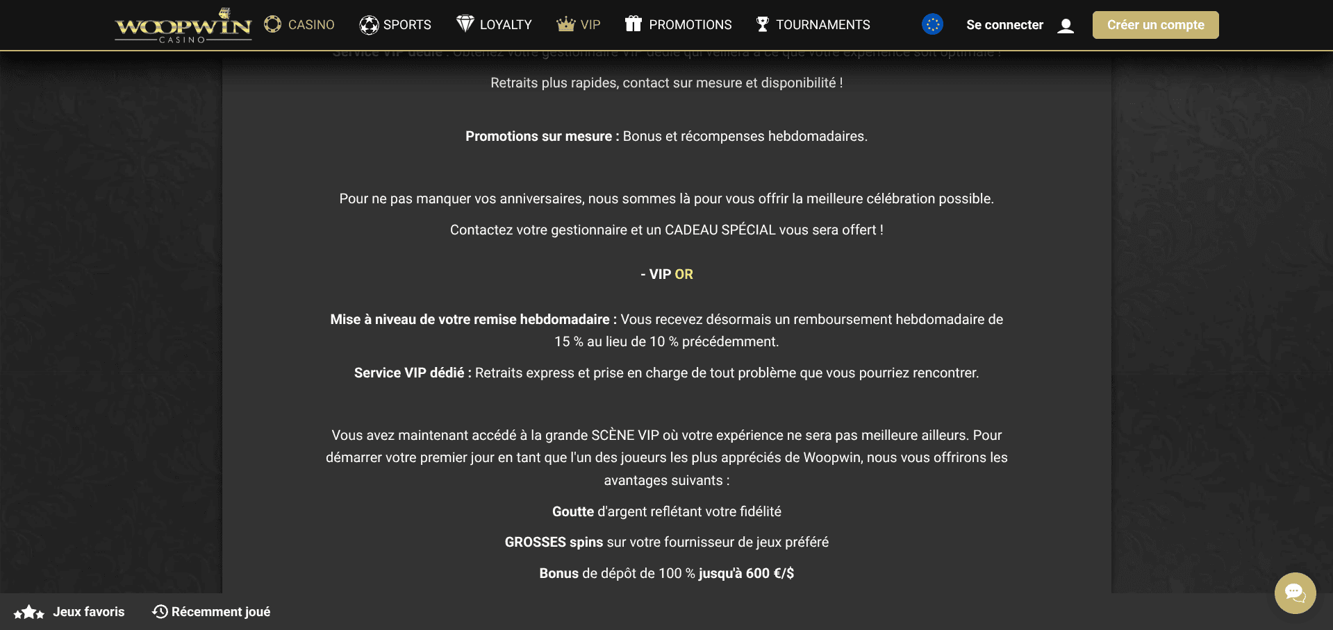 Le programme VIP du casino en ligne Woopwin est plutôt classique. Il fonctionne sur la base de plusieurs niveaux, trois au total, Bronze, Argent et Or. Plus vous effectuez d’actions (dépôts, mises, gains), plus vous avancez dans la hiérarchie VIP. Chaque palier franchi vous permet alors de profiter d’avantages comme :